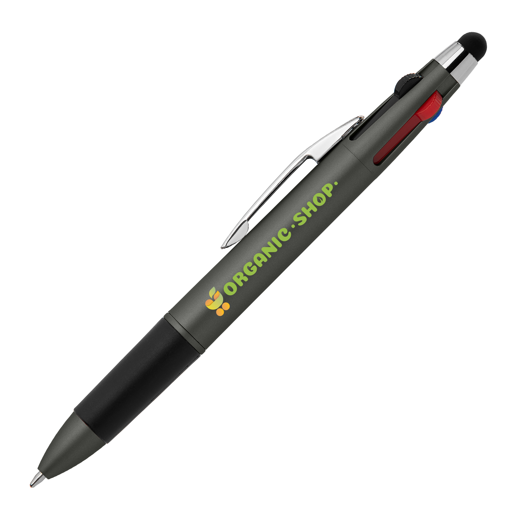 Der InkEssence Softy Metallic Multi-Tinten Kugelschreiber mit Stylus wird Ihre Kunden begeistern! Besonders durch das elegante Soft-Touch-Finish und die Auswahl an hochwertigen Metallic-Farben. Dieser praktische Click-Action-Kugelschreiber vereint vier Tintenfarben – Rot, Grün, Blau und Schwarz – in einem Stift. Der komfortable Soft-Grip und der Stylus, der auf Smartphones, Tablets und anderen Touchscreen-Geräten verwendet werden kann, machen ihn zu einem besonders vielseitigen und funktionalen Schreibgerät.