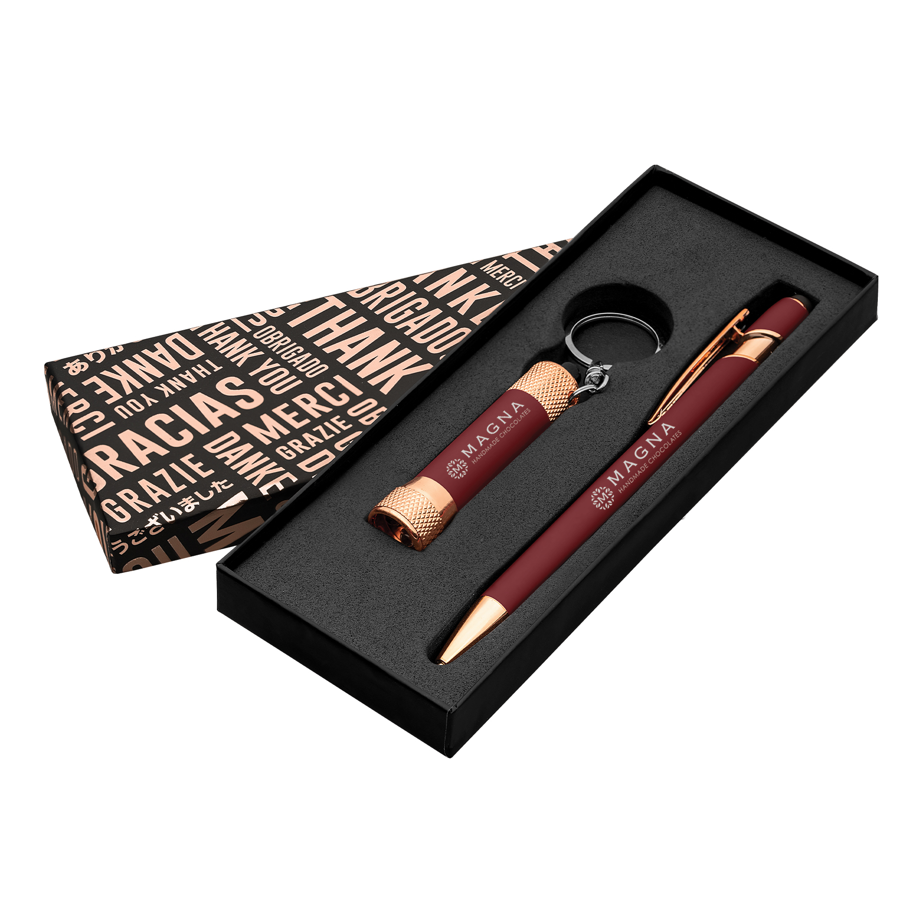 Ob für einen wertvollen Kunden oder einen engagierten Mitarbeiter – bei uns finden Sie das perfekte „Danke“. Unser Geschenkset, verziert mit roségoldenen Akzenten und verpackt in einer stilvollen „Dankeschön“-Box, enthält einen trendigen Kugelschreiber und eine Taschenlampe, beide farblich aufeinander abgestimmt. Dieses Set, bekannt als „Miami Gold Danke“ oder auch als „Mia Geschenkset mit Roségold-Akzenten und Dankeschön-Schachtel“, ist ein echter Bestseller. Der Kugelschreiber ist mit einer Stylus-Spitze für Touchscreens ausgestattet, während die Taschenlampe mit einem Schlüsselanhänger und drei LED-Lichtern versehen ist. Beide Artikel werden mit Ihrem Logo graviert und in einer eleganten schwarzen Geschenkschachtel mit einem roségoldenen „Danke“-Schriftzug geliefert – fertig zum Verschenken.