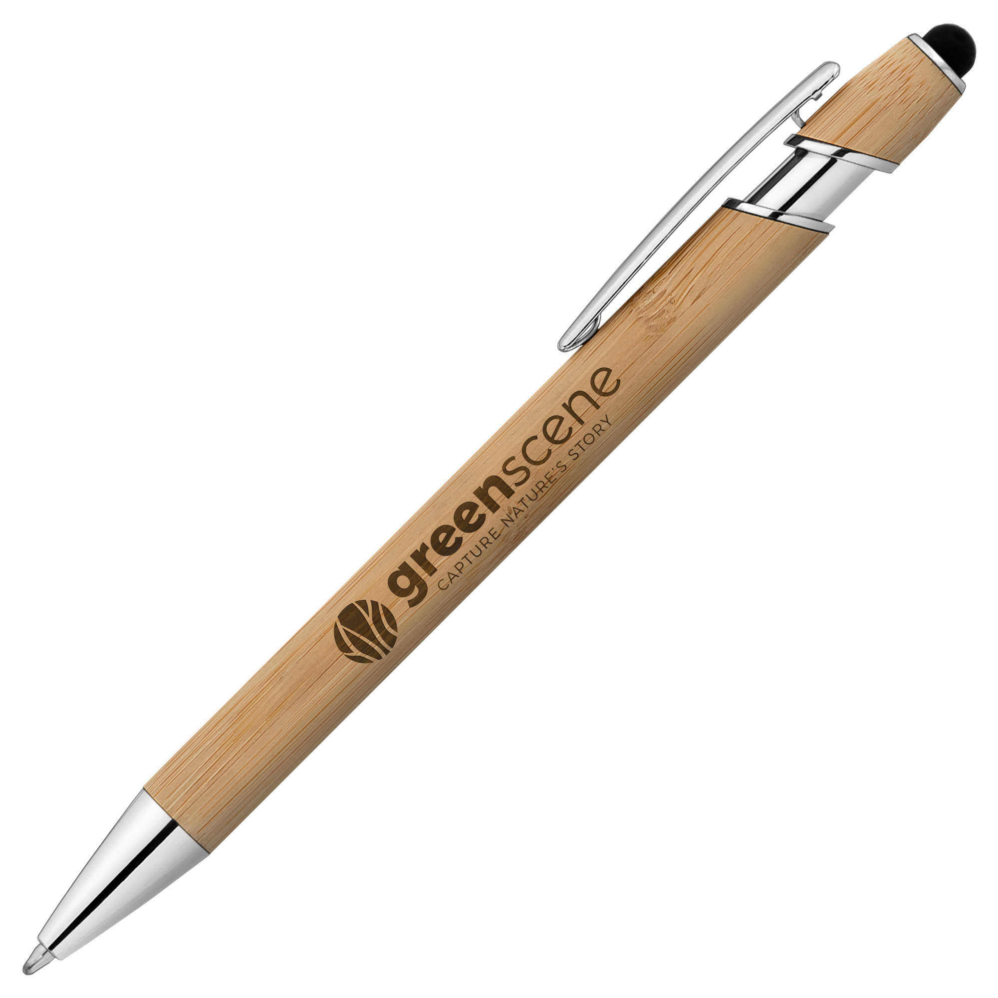 Der Kugelschreiber „Bamboo Holz“ verfügt über einen nachhaltigeren Bambusschaft für einen erdigen Look und eine weiche Haptik, und Ihr Logo ist für eine lang anhaltende Sichtbarkeit lasergraviert. Ihre Empfänger werden den praktischen Stylus für die Verwendung auf Touchscreens zu schätzen wissen. Dieser Kugelschreiber, auch bekannt unter dem Namen „Alpha Bambus-Kugelschreiber mit Gravur und Stylus“ und Ihr Branding werden das ganze Jahr über einen festen Platz auf dem Schreibtisch und in der Hand haben.