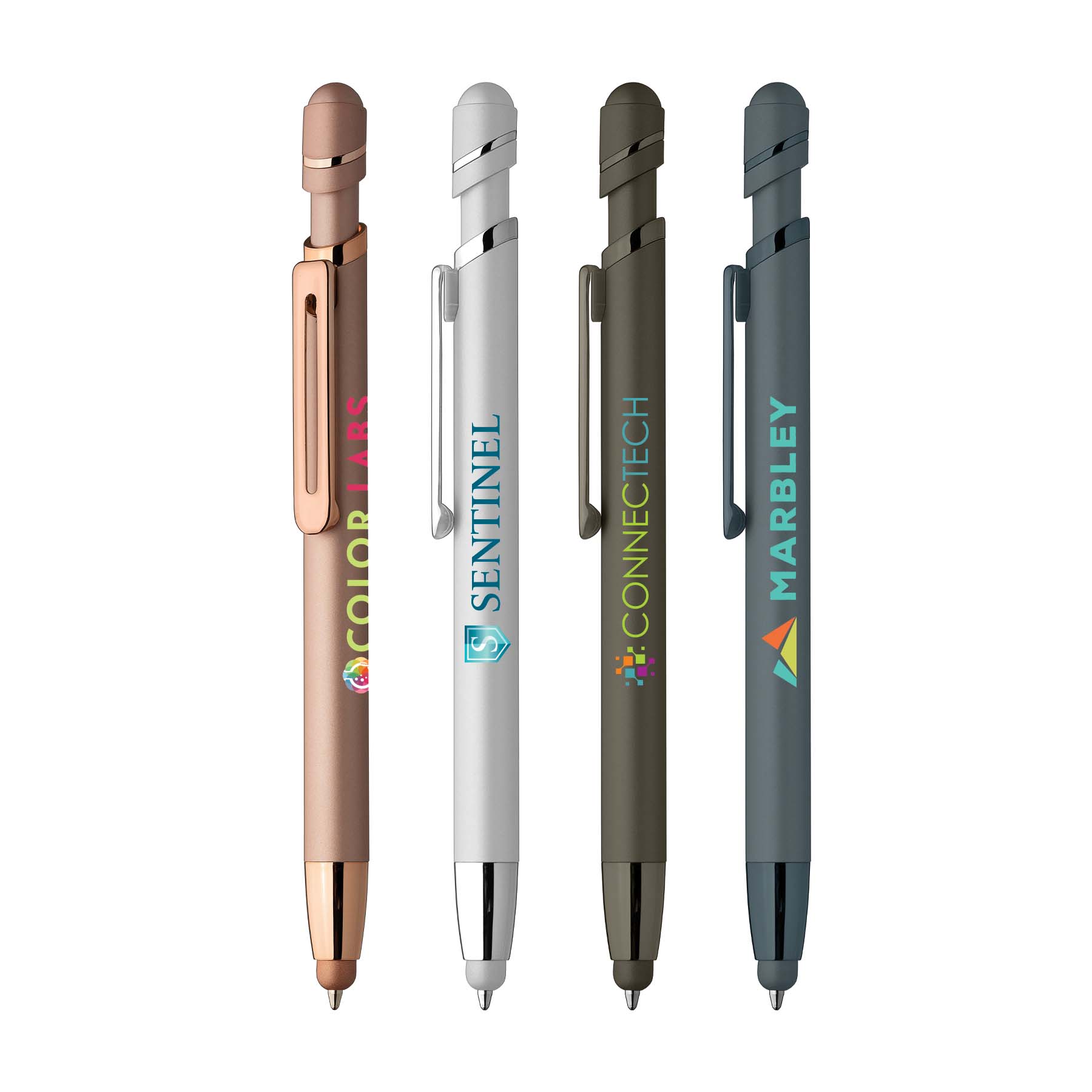 Der Kugelschreiber „Capri“, auch als „Metall Soft Touch Molly Stylus Stift“ bekannt, überzeugt durch sein modernes monochromatisches Design. Der luxuriöse Soft-Touch-Schaft und die farblich abgestimmten metallischen Akzente verleihen ihm einen frischen, zeitgemäßen Look. Zusätzlich bietet der kapazitive Stift praktische Touchscreen-Funktionalität. Bringen Sie Ihr Logo oder Ihren Text mit UV-Digitaldruck oder hochwertiger Lasergravur gekonnt zur Geltung.