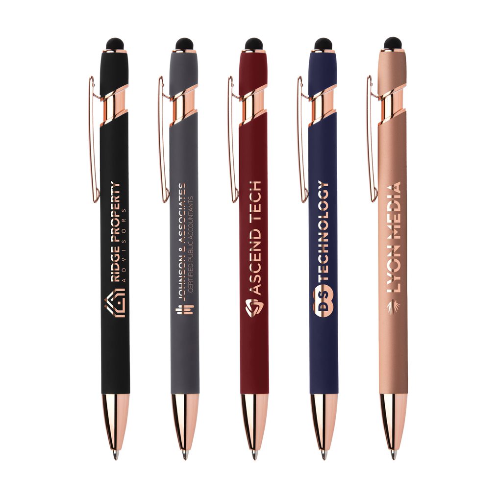 Dieser Kugelschreiber besticht durch seine Soft-Touch-Oberfläche, die in verschiedenen Farben erhältlich ist. Er verfügt über einen stilvoll abgestimmten Stylus, der ideal für Touchscreens geeignet ist. Mit unserer präzisen Spieglanz-Gold-Lasergravur setzen Sie Ihren Firmennamen, Ihr Logo oder Ihre Werbebotschaft perfekt in Szene. Der Kugelschreiber „Miami Gold“, auch bekannt als „Alpha Soft Touch Stylus Kugelschreiber mit rosegoldenem Spiegelaufdruck“, wird sicherlich zu einem Favoriten Ihrer Kunden werden!