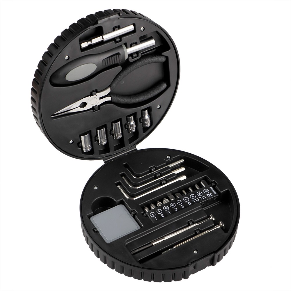 Das Werkzeugset Reifen 25 St. ist der perfekte Imageträger für Ihre Marke. Mit einer praktischen und stilvollen Reifenform zieht es die Aufmerksamkeit bei jedem Einsatz an. Hergestellt aus robustem ABS und Metall, garantiert es nicht nur Langlebigkeit, sondern erleichtert auch den Alltag Ihrer Kunden, indem es schnelle Lösungen für Kleinreparaturen bietet.